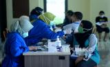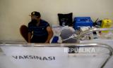 REPUBLIKA.CO.ID, JAKARTA -- Petugas kesehatan Puskesmas Kecamatan Pancoran memanggil warga yang berusia 18 tahun ke untuk disuntik vaksin COVID-19 di GOR Pengadegan, Jakarta, Kamis (10/6).