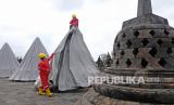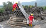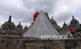 REPUBLIKA.CO.ID, MAGELANG -- Petugas Balai Konservasi Borobudur (BKB) membuka terpaulin penutup stupa candi Borobudur Magelang, Jawa Tengah, Kamis (10/6/2021). Pembukaan terpaulin yang terpasang sejak bulan November 2020 guna mengantisipasi guyuran abu vulkanik erupsi gunung Merapi tersebut, karena menurut Badan Penyelidikan dan Pengembangan Teknologi Kebencanaan Geologi (BPPTKG) Yogyakarta, Candi Borobudur aman dari ancaman bahaya erupsi Gunung Merapi.