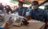 Pekerja transportasi umum melakukan tes kesehatan sebelum menjalani vaksinasi Covid-19 di Terminal Kampung Rambutan, Jakarta, Kamis (10/6). Vaksinasi massal tersebut diperuntukan bagi pelaku transportasi umum dan warga sekitar dengan target sebanyak 1.000 orang telah disuntik vaksin. Program vaksinasi Covid-19 di DKI Jakarta memasuki tahap ketiga dengan sasaran masyarakat rentan dari aspek geospasial, sosial, ekonomi, serta masyarakat yang berada di daerah dengan kasus positif Covid-19 tinggi. Republika/Thoudy Badai (FOTO : Republika/Thoudy Badai)