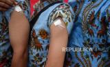 Pekerja transportasi umum memperlihatkan bekas disuntik vaksin Covid-19 di Terminal Kampung Rambutan, Jakarta, Kamis (10/6). Vaksinasi massal tersebut diperuntukan bagi pelaku transportasi umum dan warga sekitar dengan target sebanyak 1.000 orang telah disuntik vaksin. Program vaksinasi Covid-19 di DKI Jakarta memasuki tahap ketiga dengan sasaran masyarakat rentan dari aspek geospasial, sosial, ekonomi, serta masyarakat yang berada di daerah dengan kasus positif Covid-19 tinggi. Republika/Thoudy Badai (FOTO : Republika/Thoudy Badai)