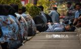 Pekerja transportasi umum menuggu surat vaksinasi Covid-19 di Terminal Kampung Rambutan, Jakarta, Kamis (10/6). Vaksinasi massal tersebut diperuntukan bagi pelaku transportasi umum dan warga sekitar dengan target sebanyak 1.000 orang telah disuntik vaksin. Program vaksinasi Covid-19 di DKI Jakarta memasuki tahap ketiga dengan sasaran masyarakat rentan dari aspek geospasial, sosial, ekonomi, serta masyarakat yang berada di daerah dengan kasus positif Covid-19 tinggi. Republika/Thoudy Badai (FOTO : Republika/Thoudy Badai)