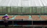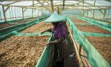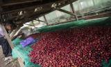 Petani menjemur kopi jenis arabika di Puntang Kopi, Banjaran, Kabupaten Bandung, Jawa Barat, Kamis (10/6/2021). Puntang kopi mampu memproduksi berbagai jenis rasa dan pengolahan kopi yang berbeda sebanyak 100 ton pertahunnya dan dijual ke berbagai daerah di Indonesia dengan kisaran harga dari Rp125 ribu - Rp160 ribu per kg. (FOTO : ANTARA/M Agung Rajasa)