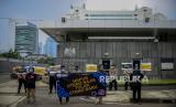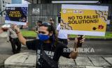 REPUBLIKA.CO.ID, JAKARTA -- Sejumlah massa aksi menunjukkan poster dan spanduk tuntutan saat melaksanakan aksi di depan Kedutaan Besar Inggris, Kuningan, Jakarta, Jumat (11/6). WALHI DKI Jakarta dan KRuHA melakukan protes aksi simbolis bertepatan dengan pertemuan pimpinan berbagai negara pada KTT G7 di Inggris.