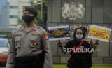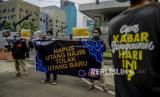 Sejumlah massa aksi menunjukan poster dan spanduk tuntutan saat melaksanakan aksi di depan Kedutaan Besar Inggris, Kuningan, Jakarta, Jumat (11/6). WALHI DKI Jakarta dan KRuHA melakukan protes aksi simbolik bertepatan dengan pertemuan pimpinan berbagai negara pada KTT G7 di Inggris, dengan tema tuntutan Batalkan Hutang Baru dan Hapus Hutang Lama yang dinilai dapat mengurangi beban anggaran publik untuk digunakan sebagai dana untuk keberlangsungan hidup masyarakat terutama di masa pandemi Covid-19. (FOTO : Republika/Putra M. Akbar)