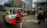 Pemulung mendorong gerobaknya saat massa melaksanakan aksi di depan Kedutaan Besar Inggris, Kuningan, Jakarta, Jumat (11/6). WALHI DKI Jakarta dan KRuHA melakukan protes aksi simbolik bertepatan dengan pertemuan pimpinan berbagai negara pada KTT G7 di Inggris, dengan tema tuntutan Batalkan Hutang Baru dan Hapus Hutang Lama yang dinilai dapat mengurangi beban anggaran publik untuk digunakan sebagai dana untuk keberlangsungan hidup masyarakat terutama di masa pandemi Covid-19. (FOTO : Republika/Putra M. Akbar)