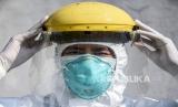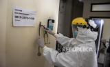 Tenaga kesehatan mengenakan alat pelindung diri (APD) sebelum mengantarkan obat dan makanan untuk pasien Covid-19 di Gedung BLK Manggahang, Baleendah, Kabupaten Bandung, Ahad (13/6). Berdasarkan hasil data yang dihimpun dari situs covid19.bandungkab.go.id hingga (12/6) pukul 04.17 WIB tercatat kasus terkonfirmasi Covid-19 di Kabupaten Bandung sudah mencapai 15.652 kasus dan angka kematian akibat Covid-19 sebanyak 265 orang sementara jumlah pasien yang dinyatakan sembuh mencapai 13.870 kasus. (FOTO : REPUBLIKA/ABDAN SYAKURA)