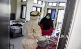 Tenaga kesehatan memberikan obat dan makanan ke pasien Covid-19 yang sedang menjalani isolasi di Gedung BLK Manggahang, Baleendah, Kabupaten Bandung, Ahad (13/6). Berdasarkan hasil data yang dihimpun dari situs covid19.bandungkab.go.id hingga (12/6) pukul 04.17 WIB tercatat kasus terkonfirmasi Covid-19 di Kabupaten Bandung sudah mencapai 15.652 kasus dan angka kematian akibat Covid-19 sebanyak 265 orang sementara jumlah pasien yang dinyatakan sembuh mencapai 13.870 kasus. Foto: Republika/Abdan Syakura (FOTO : REPUBLIKA/ABDAN SYAKURA)