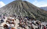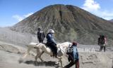 Pemilik mengantarkan pengunjung berkuda di Gunung Bromo, Probolinggo, Jawa Timur, Ahad(13/6/2021). Para pemilik kuda tersebut menawarkan jasanya kepada wisatawan yang ingin menuju puncak Gunung Bromo menggunakan kuda dengan tarif Rp50 ribu sampai Rp150 ribu. (FOTO : ANTARA/Umarul Faruq)