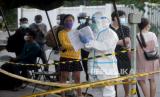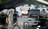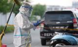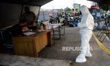 Petugas kesehatan dengan menggunakan baju hazmat melapor di pos masuk saat mengantarkan pasien Covid-19 di Rumah Sakit Darurat Covid-19 Wisma Atlet, Jakarta, Ahad (13/6). Presentase ketersedian tempat tidur pasien Covid-19 hanya tersisa 19 persen di Rumah Sakit Darurat (RSD) Wisma Atlet, per Ahad (13/6) pagi. Berkurangnya ketersediaan tempat tidur karena jumlah pasien masuk rata-rata sekitar 403 orang per hari.Prayogi/Republika (FOTO : Prayogi/Republika.)