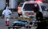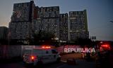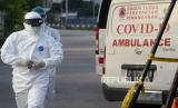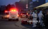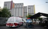 Sebuah ambulance yang membawa pasien Covid-19 memasuki Kawasan Rumah Sakit Darurat Covid-19 Wisma Atlet, Jakarta, Ahad (13/6). Presentase ketersedian tempat tidur pasien Covid-19 hanya tersisa 19 persen di Rumah Sakit Darurat (RSD) Wisma Atlet, per Ahad (13/6) pagi. Berkurangnya ketersediaan tempat tidur karena jumlah pasien masuk rata-rata sekitar 403 orang per hari.Prayogi/Republika (FOTO : Prayogi/Republika.)