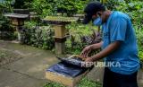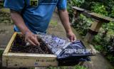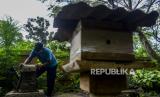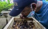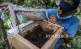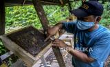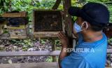 Petugas memeriksa sarang lebah madu yang dibudidayakan di Hutan Kota Srengseng, Kembangan, Jakarta, Rabu (16/6). Dinas Pertamanan dan Hutan Kota DKI Jakarta membudidayakan lebah trigona yang hasil produksinya dijual seharga Rp 125.000 per 300 mili liter dan menjadi salah satu wisata alternatif di Jakarta. Republika/Putra M. Akbar (FOTO : Republika/Putra M. Akbar)
