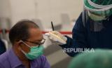 Petugas medis memeriksa kesehatan karyawan Danone Indonesia sebelum disuntikan vaksin Covid-19 saat pelaksanaan Vaksinasi Covid-19 Gotong Royong Danone Indonesia di Sentul, Bogor, Jawa Barat, Kamis (17/6). Danone Indonesia melaksanakan Vaksinasi Gotong Royong tahap pertama yang diberikan kepada 5000 karyawan di wilayah Jabodetabek dan Jawa Barat pada tanggal 8-24 Juni 2021 di 17 titik vaksinasi sebagai upaya dukungan percepatan pemulihan ekonomi dan kesehatan nasional.Prayogi/Republika. (FOTO : Prayogi/Republika.)