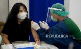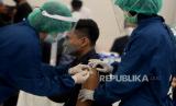 Petugas medis menyuntikan vaksin Covid-19 kepada karyawan Danone Indonesia saat pelaksanaan Vaksinasi Covid-19 Gotong Royong Danone Indonesia di Sentul, Bogor, Jawa Barat, Kamis (17/6). Danone Indonesia melaksanakan Vaksinasi Gotong Royong tahap pertama yang diberikan kepada 5.000 karyawan di wilayah Jabodetabek dan Jawa Barat pada tanggal 8-24 Juni 2021 di 17 titik vaksinasi sebagai upaya dukungan percepatan pemulihan ekonomi dan kesehatan nasional. (FOTO : Prayogi/Republika.)
