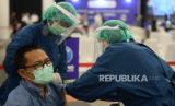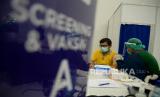 Petugas medis menyuntikan vaksin Covid-19 kepada karyawan Danone Indonesia saat pelaksanaan Vaksinasi Covid-19 Gotong Royong Danone Indonesia di Sentul, Bogor, Jawa Barat, Kamis (17/6). Danone Indonesia melaksanakan Vaksinasi Gotong Royong tahap pertama yang diberikan kepada 5000 karyawan di wilayah Jabodetabek dan Jawa Barat pada tanggal 8-24 Juni 2021 di 17 titik vaksinasi sebagai upaya dukungan percepatan pemulihan ekonomi dan kesehatan nasional.Prayogi/Republika. (FOTO : Prayogi/Republika.)