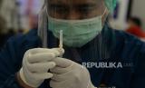 Petugas medis menyiapkan vaksin Covid-19 sebelum disuntikan kepada karyawan Danone Indonesia saat pelaksanaan Vaksinasi Covid-19 Gotong Royong Danone Indonesia di Sentul, Bogor, Jawa Barat, Kamis (17/6). Danone Indonesia melaksanakan Vaksinasi Gotong Royong tahap pertama yang diberikan kepada 5000 karyawan di wilayah Jabodetabek dan Jawa Barat pada tanggal 8-24 Juni 2021 di 17 titik vaksinasi sebagai upaya dukungan percepatan pemulihan ekonomi dan kesehatan nasional.Prayogi/Republika. (FOTO : Prayogi/Republika.)