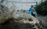 REPUBLIKA.CO.ID, BANDUNG -- Pengendara sepeda motor melintasi genangan air yang merendam kawasan Gedebage, Bandung, Jawa Barat, Kamis (17/6).