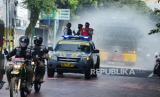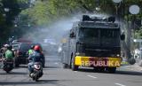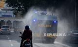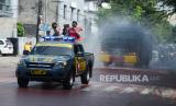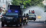 Dengan menggunakan kendaraan taktis, petugas kepolisian dari Polrestabes Bandung berkeliling Kota mengingatkan warga agar tidak abai protokol kesehatan (Prokes), sosialisasi penutupan jalan sekaligus penyemprotan disinfektan, Jumat (18/6). Melonjaknya kasus Covid-19 di Kota Bandung, membuat semua unsur terkait melakukan upaya penanganan dan pencegahan untuk mecegah kasus positif Covid-19 di Kota Bandung tidak semakin meningkat. (FOTO : Edi Yusuf/Republika)