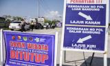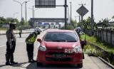 REPUBLIKA.CO.ID, BANDUNG -- Petugas gabungan menyekat kendaraan dengan pelat nomor luar Bandung saat operasi PPKM mikro di gerbang keluar Tol Soreang, Kabupaten Bandung, Ahad (20/6).