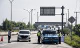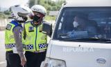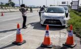 Petugas kepolisian memeriksa identitas dan surat keterangan sehat dari pengemudi kendaraan dengan pelat nomor luar Bandung saat operasi ppkm mikro di gerbang keluar Tol Soreang, Kabupaten Bandung, Ahad (20/6). Penyekatan dan pemeriksaan tersebut merupakan tindak lanjut dari status wilayah Bandung Raya siaga satu Covid-19 serta ditujukan untuk menekan mobilitas kendaraan agar tidak masuk ke wilayah Bandung Raya demi mencegah penyebaran Covid-19. Foto: Republika/Abdan Syakura (FOTO : REPUBLIKA/ABDAN SYAKURA)