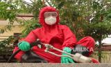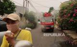 Petugas Pemadam Kebakaran (Damkar) bersiap saat akan melakukann penyemprotan cairan ekoenzim untuk mencegah penyebaran virus covid 19 di lingkungan perumahan Komplek Depkes RW 04 Sunter Jaya, Jakarta, Ahad (20/6). Penyemprotan cairan ekoenzim di lingkungan ini merupakan kerjasama antara Kadis LH DKI Jakarta, Kasudin LH Jakarta Utara serta Camat dan Kelurahan setempat. Foto: darmawan/republika. (FOTO : REPUBLIKA)