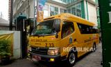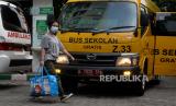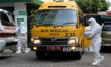 Bus Sekolah yang membawa pasien COVID-19 menuju Rumah Sakit Darurat Wisma Atlet meninggalkan Puskesmas Kecamatan Menteng, Jakarta, Ahad (20/6). Laju kasus harian Covid-19 di Indonesia beberapa hari terakhir dalam tren menanjak, Hal ini membuat angka 2 juta kasus infeksi Covid-19 di Indonesia berada di depan mata.Prayogi/Republika. (FOTO : Prayogi/Republika.)
