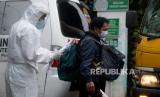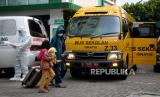REPUBLIKA.CO.ID, JAKARTA -- Pasien COVID-19 menaiki bus Sekolah yang akan membawa mereka menuju Rumah Sakit Darurat Wisma Atlet di Puskesmas Kecamatan Menteng, Jakarta, Ahad (20/6).
