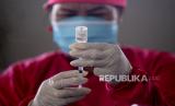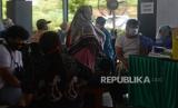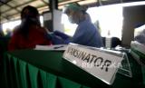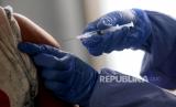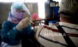 REPUBLIKA.CO.ID, JAKARTA -- Petugas kesehatan memeriksa kesehatan warga sebelum disuntik vaksin Covid-19 di Pondok Pesantren Minhaajurrosyidiin di Jakarta, Senin (21/6).