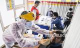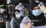 REPUBLIKA.CO.ID, BEKASI -- Petugas mengukur suhu tubuh calon penumpang KRL (Kereta Rel Listrik) yang akan melakukan tes usap antigen di Stasiun Bekasi, Jawa Barat, Senin (21/6/2021). PT KAI Commuter melakukan tes acak kepada penumpang KRL dari tanggal 21-27 Juni 2021 guna mencegah penyebaran wabah COVID-19.