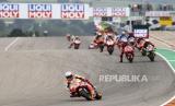 Pembalap Spanyol Marc Marquez dari Tim Repsol Honda memimpin posisi saat pertandingan balap Moto GP di sirkuit Sachsenring, Hohenstein-Ernstthal, Jerman, Ahad (20/6). Pertandingan Moto GP Jerman 2021 dimenangkan oleh Marc Marquez yang menempati posisi pertama dengan catatan waktu 41 menit 7,243 detik. (Jan Woitas/dpa via AP)Putra M. Akbar (FOTO : dpa-Zentralbild)
