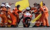 Pembalap MotoGP Spanyol Marc Marquez (tengah) dari Tim Repsol Honda merayakan kemenangannya bersama para track marshal setelah memenangkan Grand Prix Sepeda Motor Jerman di sirkuit balap Sachsenring di Hohenstein-Ernstthal, Jerman, 20 Juni 2021. (FOTO : EPA-EFE/FILIP SINGER)