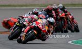Pembalap MotoGP Spanyol Marc Marquez (depan) dari Tim Repsol Honda memimpin dalam perjalanannya untuk memenangkan Grand Prix Sepeda Motor Jerman di sirkuit balap Sachsenring di Hohenstein-Ernstthal, Jerman, 20 Juni 2021. (FOTO : EPA)