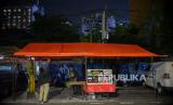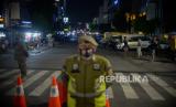 Petugas Satpol PP berjaga di kawasan Sabang saat jam penutupan jalan di Jakarta, Senin (21/6). Polda Metro Jaya melakukan penutupan 10 ruas jalan di Jakarta pada pukul 21.00 hingga 04.00 WIB mulai hari ini Senin 21 Juni 2021 dalam rangka pembatasan kegiatan masyarakat mengingat kasus positif Covid-19 harian di Jakarta mengalami peningkatan. Republika/Thoudy Badai (FOTO : Republika/Thoudy Badai)
