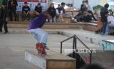 REPUBLIKA.CO.ID, TANGERANG -- Pemain skateboard melakukan aksi melompati papan skateboard di Marchand Hype Station, Tangerang Selatan, Banten, Senin (21/6). Kegiatan yang diikuti oleh berbagai komunitas skateboard dari berbagai daerah tersebut untuk merayakan Hari Skateboard Internasional yang digelar di tengah mewabahnya virus SARS-CoV-2 penyebab COVID-19.