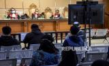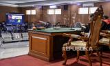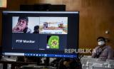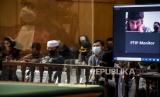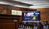 REPUBLIKA.CO.ID, BANDUNG -- Tampilan layar yang menayangkan terdakwa kasus penganiayaan Bahar bin Smith saat menjalani sidang vonis di Pengadilan Negeri (PN) Bandung, Jalan LLRE Martadinata, Kota Bandung, Selasa (22/6). Majelis Hakim menjatuhkan vonis kepada Bahar bin Smith dengan hukuman tiga bulan penjara setelah terbukti bersalah atas kasus penganiayaan terhadap sopir taksi daring pada tahun 2018 lalu. Foto: Republika