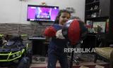 Seniman termuda di Suriah, Rayan al-Abed (5 tahun) berlatih tinju di rumahnya di Damaskus, Suriah, Sabtu (19/6). Belum lama ini, Rayan mengadakan pameran tunggal di Pusat Kebudayaan Suriah. Dia mulai melukis sejak usia dua tahun karena melihat kakeknya Bashir al-Bashir yang juga seorang seniman. EPA-EFE/YOUSSEF BADAWI ATTENTION: This Image is part of a PHOTO SETPutra M. Akbar (FOTO : EPA-EFE/YOUSSEF BADAWI)
