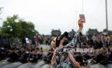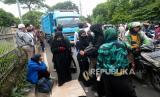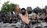 Massa aksi dari pendukung Habib Rizieq Shihab (HRS) berfoto saat petugas kepolisian memblokade Jalan I Gusti Ngurah Rai menuju Pengadilan Negeri Jakarta Timur, Jakarta, Kamis (24/6). Aksi massa tersebut dalam rangka mengawal sidang pembacaan vonis terhadap Habib Rizieq Shihab terkait kasus tes Swab di Rumah Sakit Ummi, Bogor. (FOTO : Republika/Thoudy Badai)