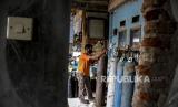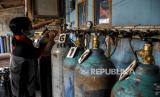 Pekerja melakukan proses isi ulang tabung oksigen di agen isi ulang oksigen, Jalan A H Nasution, Arcamanik, Kota Bandung, Kamis (24/6). Seiring melonjaknya kasus Covid-19 di Kota Bandung, permintaan oksigen untuk kebutuhan medis rumahan dan rumah sakit mengalami peningkatan sebesar 50 persen atau 250 tabung oksigen per hari dibandingkan dengan sebelum lonjakan kasus Covid-19 yang hanya 100 tabung per hari. Foto: Republika/Abdan Syakura (FOTO : REPUBLIKA/ABDAN SYAKURA)