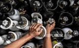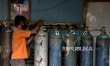 Pekerja memeriksa tabung oksigen di agen isi ulang oksigen, Jalan A H Nasution, Arcamanik, Kota Bandung, Kamis (24/6). Seiring melonjaknya kasus Covid-19 di Kota Bandung, permintaan oksigen untuk kebutuhan medis rumahan dan rumah sakit mengalami peningkatan sebesar 50 persen atau 250 tabung oksigen per hari dibandingkan dengan sebelum lonjakan kasus Covid-19 yang hanya 100 tabung per hari. Foto: Republika/Abdan Syakura (FOTO : REPUBLIKA/ABDAN SYAKURA)