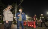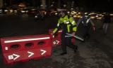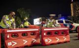 REPUBLIKA.CO.ID, PALEMBANG -- Petugas gabungan dari Polrestabes Palembang, Pol PP dan Dishub menyusun pembatas saat akan menutup jalan dalam rangka pembatasan mobilitas warga guna menekan penyebaran COVID-19 di Jalan POM IX, Palembang, Sumatera Selatan, Rabu (23/6) malam. Pembatasan tersebut dilakukan mulai pukul 21.00 WIB hingga 00.00 WIB di delapan titik persimpangan di Kota Palembang.