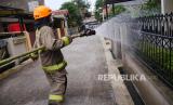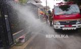 DESINFEKSI KUJANGSARI: Petugas Dinas Pemadam Kebakaran dan Penanggulangan Bencana UPT Selatan Kota Bandung menyemprotkan desinfektan di Kompleks Jaka Purwa Kelurahan Kujangsari, Kecamatan Bandung Kidul. Menyusul lonjakan kasus baru harian Covid-19 di Bandung Raya, di Kelurahan ini terdapat 100 lebih kasus aktif Dovid-19. (FOTO : Republika/Yogi Ardhi)