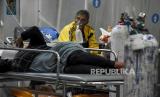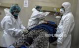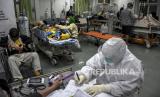 Petugas kesehatan memeriksa kondisi kesehatan pasien di ruang Instalasi Gawat Darurat di RSUD Al Ihsan, Baleendah, Kabupaten Bandung, Jumat (25/6). Akibat lonjakan kasus positif Covid-19 di Kabupaten Bandung yang saat ini berstatus zona merah Covid-19, tingkat keterisian tempat tidur atau Bed Occupancy Rate (BOR) di rumah sakit tersebut mencapai 95,53 persen, melampaui ambang batas aman BOR yang ditetapkan Organisasi Kesehatan Dunia (WHO) sebesar 60 hingga 80 persen. Republika/Abdan Syakura (FOTO : REPUBLIKA/ABDAN SYAKURA)