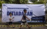 REPUBLIKA.CO.ID, BANDUNG -- Warga melintas di dekat spanduk pemberitahuan di depan Masjid Salman ITB, Jalan Ganesa, Kota Bandung, Jumat (25/6). Pengurus DKM Masjid Salman ITB meniadakan sementara ibadah Shalat Jumat yang berlaku mulai Jumat (25/6). Keputusan tersebut sebagai tindak lanjut dari perubahan status Kota Bandung menjadi zona merah Covid-19 dan Surat Edaran Menteri Agama Nomor 13 Tahun 2021 tentang Pembatasan Pelaksanaan Kegiatan Keagamaan di Rumah Ibadah.