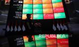 Karyawan melintas di dekat layar monitor pergerakan Indeks Harga Saham Gabungan (IHSG) di Bursa Efek Indonesia, Jakarta, Jumat (25/6/2021). Pada penutupan sesi I, IHSG terpantau menguat 36,24 poin ke level 6.050, atau naik 0,62 persen di tengah melonjaknya angka kasus positif COVID-19. A (FOTO : Antara/Reno Esnir)