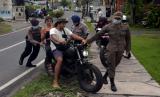 Anggota Polisi dan Satpol PP Kabupaten Badung menghentikan warga negara asing (WNA) yang melanggar protokol kesehatan saat operasi penertiban prokes dalam Pemberlakuan Pembatasan Kegiatan Masyarakat (PPKM) skala mikro di Desa Canggu, Badung, Bali, Jumat (25/6/2021). Tim satgas gabungan menindak sebanyak 18 orang WNA yang berasal dari berbagai negara tersebut untuk memberikan efek jera agar menerapkan protokol kesehatan dalam upaya pencegahan penyebaran varian baru COVID-19 di kawasan pariwisata itu. (FOTO : ANTARA/Nyoman Hendra Wibowo)
