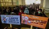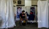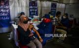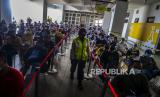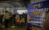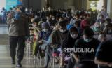 REPUBLIKA.CO.ID, CIBINONG -- Polisi mengatur barisan warga yang akan disuntik vaksin Covid-19 saat vaksinasi massal di Stadion Pakansari, Cibinong, Kabupaten Bogor, Jawa Barat, Sabtu (26/6). Vaksinasi massal yang diselenggarakan oleh Polri secara serentak di 34 Polda itu dilakukan kepada 1.031.056 masyarakat di Indonesia dalam rangka memperingati HUT Bhayangkara ke-75.