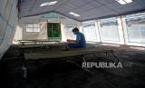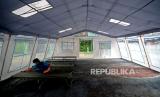 Petugas kebersihan menyapu bagian dalam tenda darurat di Halaman SDN 02 Cideng, Jakarta, Selasa (29/6). RSUD Tarakan mendirikan tenda darurat guna mengantisipasi lonjakan kasus covid-19 dihalaman SDN 02 Cideng yang berada tepat di sebelah RSUD Tarakan.Prayogi/Republika. (FOTO : Prayogi/Republika.)