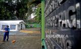 Keamanan sekolah melintas didekat tenda darurat yang didirikan di Halaman SDN 02 Cideng, Jakarta, Selasa (29/6). RSUD Tarakan mendirikan tenda darurat guna mengantisipasi lonjakan kasus covid-19 dihalaman SDN 02 Cideng yang berada tepat di sebelah RSUD Tarakan.Prayogi/Republika. (FOTO : Prayogi/Republika.)