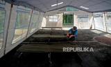 Petugas kebersihan merapikan velbed yang berada di dalam tenda darurat di Halaman SDN 02 Cideng, Jakarta, Selasa (29/6). RSUD Tarakan mendirikan tenda darurat guna mengantisipasi lonjakan kasus covid-19 dihalaman SDN 02 Cideng yang berada tepat di sebelah RSUD Tarakan. (FOTO : Prayogi/Republika.)