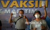 Sejumlah pelaku usaha perikanan menunjukkan bukti telah divaksin COVID-19 di Pelabuhan Perikanan Muara Angke, Penjaringan, Jakarta, Selasa (29/6/2021). TNI Angkatan Laut (AL) menggelar Serbuan Vaksinasi COVID-19 yang menyasar masyarakat maritim setempat dengan target 1.000 orang per hari untuk menyukseskan program pemerintah dalam melakukan vaksinasi kepada satu juta orang per hari. (FOTO : Antara/Aditya Pradana Putra)