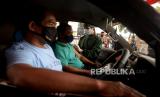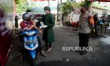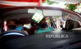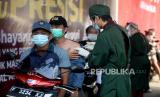 Tenaga kesehatan memeriksa kesehatan warga sebelum menyuntikan vaksin COVID-19 secara Drive Thru di Polres Metro Jakarta Selatan, Jakarta, Rabu (30/6). Polres Metro Jakarta Selatan menggelar kegiatan vaksinasi Covid-19 gratis dengan sistem drive thru dengan menyasar para pengguna kendaraan baik roda empat dan roda dua guna mempercepat target vaksinasi nasional untuk menekan lonjakan kasus COVID-19 di Indonesia. Prayogi/Republika. (FOTO : Prayogi/Republika.)